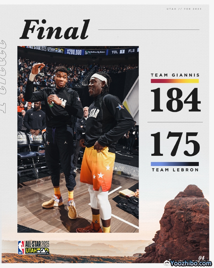 JRS直播网2月20日讯 在结束新秀赛和扣篮大赛为主的单项赛事后,NBA全明星大赛今日打响。今年规则上变化不大,依旧是前三节每节12分钟正常打,最后一节则是以前三节总得分高的一方加上24分为目标得分,率先取得目标得分的一方为胜者。赛前两队选主力和替补拉开序幕,詹姆斯队在约基奇“毛遂自荐”中建立起恩比德、欧文、东契奇、詹姆斯、约基奇的首发阵容;字母哥则是以他为主,加上塔图姆、莫兰特、米切尔和马尔卡宁。首节字母哥轻松扣篮拿下全场第一分,随后他因为手腕的伤势直接申请犯规下场就此结束自己的正赛之旅。开局对决双方依旧是不设防各种精彩暴扣拉开序幕,两队外线手感不佳,其中利拉德首节7次三分尝试仅命中1球;不过外线手感不佳不影响双方轻松拿分,首节塔图姆拿下13分双方均轰下46分。次节双方延续高效对攻,莫兰特上演360度转身扣篮,詹姆斯也是招牌的暴力砸框,马尔卡宁虽然首次入选但一点不怵甚至想来一次空接大风车暴扣,最后字母哥队以一波10-4的小高潮赢下这一节对决,同时半场总比分上99-92领先詹姆斯队。下半场字母哥外线突然爆发,其中利拉德大秀超远三分一人命中4球,塔图姆更是炸裂飚进7记三分单节砍下27分,这波疯狂进攻结束后字母哥158-141领先字母哥进入第四节,而这也意味着落后的詹姆斯队要在第四节拿到41分才能取胜,巨大分差也让末节没有太大悬念,詹姆斯队虽然尝试推速度并占据微弱上风但难以扭转局面,最终,字母哥队轻松击败詹姆斯队拿下比赛胜利。