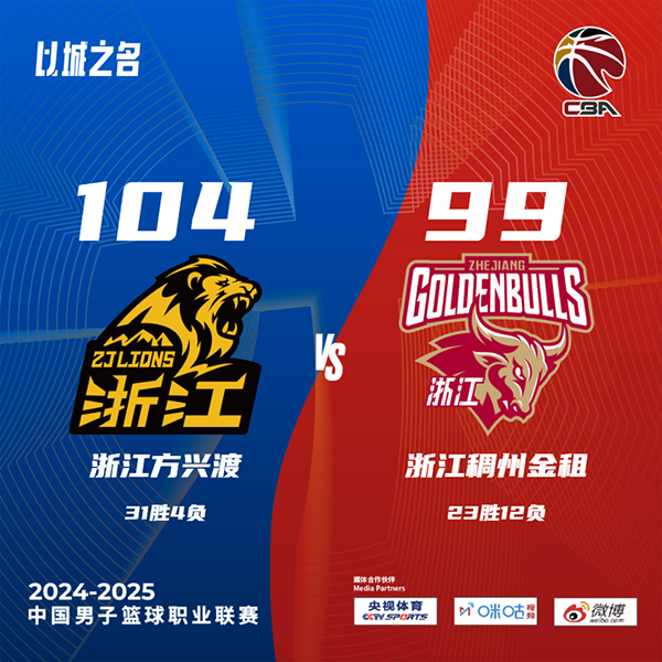 JRS直播网讯 北京时间1月25日讯 CBA常规赛迎来春节前最后一轮,领头羊广厦主场迎来与浙江的同省德比,广厦豪取11连胜,30胜4负强势领跑,浙江3连胜后战绩来到23胜11负,暂列联赛第6位。此役一上来浙江率先进入状态,内外结合轰出13-2梦幻开局,胡金秋联手布朗迅速回敬11-0攻击波,广厦立刻抹平分差,随后两队你来我往比分紧咬,首节结束时浙江领先2分,次节回来,浙江进攻断电单节仅得到14分,广厦延续火力一举反超,半场战罢,广厦确立12分优势。短暂休整后双方击鼓再战,浙江多点开花缩小分差,末段广厦及时复苏稳住局势,三节结束后广厦保有4分优势,末节上来,浙江一波9-0拉回悬念,孙铭徽关键三分一剑封喉,最终广厦104-99力克对手迎来12连胜。