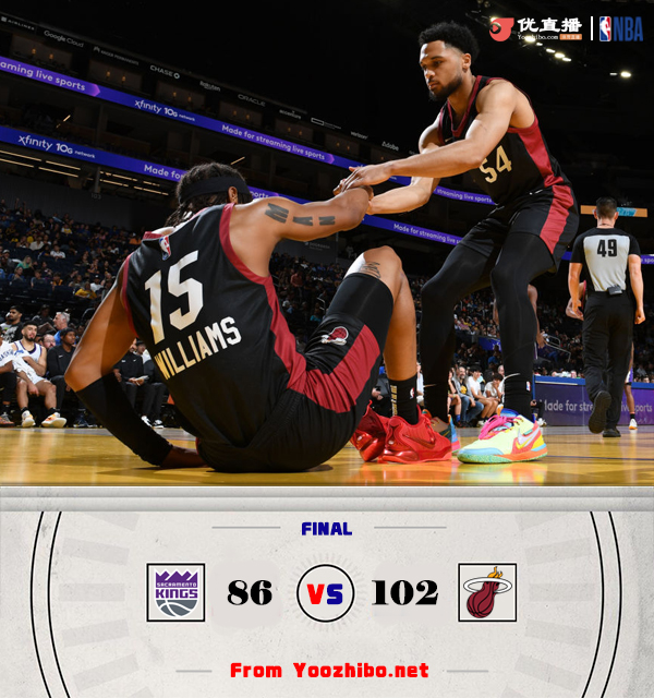 JRS直播网讯 7月8日讯 NBA夏季联赛加州经典赛,热火对阵国王。一开场,热火率先发力打出7-1的开局,国王不断冲击篮筐频频得手很快完成反超,此后双方陷入缠斗,比分交替领先,热火持续发力打出12-3的攻击波占据主动,国王连投带罚努力追赶,斯尼德造成三分犯规三罚全中后分差仅剩3分,但斯威德内外开花连得10分帮助热火56-44领先国王结束上半场。下半场,两队围绕10分分差展开拉锯战,热火不断强攻内线拿分,国王连中三分咬住,末节国王奋力反击缩小分差,热火稳扎稳打保持优势。最终,热火102-86力克国王,取得胜利。