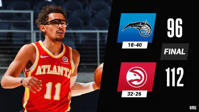 老鹰(32-26):特雷-杨25分5篮板6助攻、卡佩拉14分19篮板2盖帽、路威22分3篮板、博格达诺维奇14分4篮板2助攻、科林斯11分14篮板2助攻、许尔特15分2篮板2助攻3抢断、古德温7分5篮板3助攻