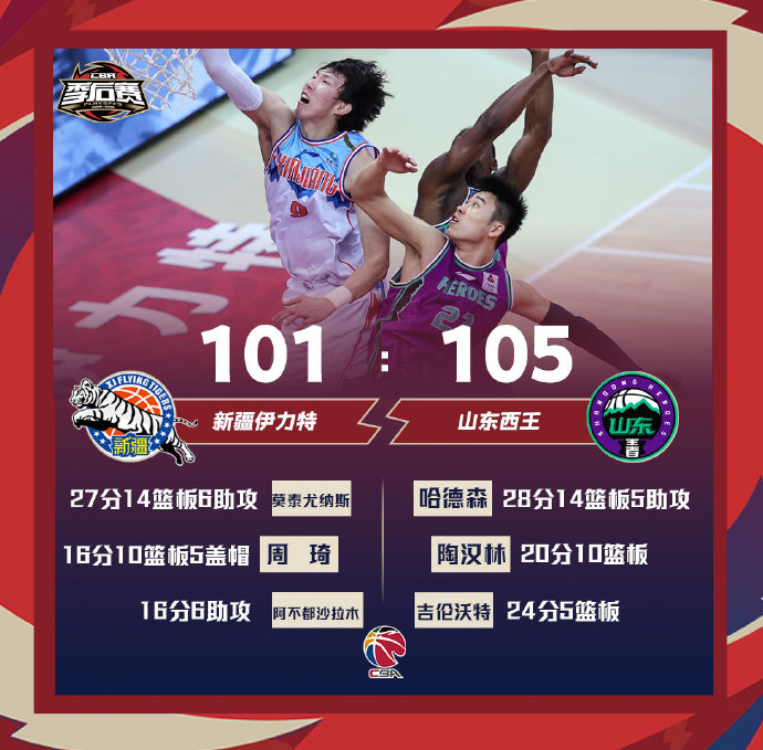山东:哈德森28分14板5助、陶汉林20分10板、陈培东13分、高诗岩10分5助、吉伦沃特24分5板、王汝恒6分