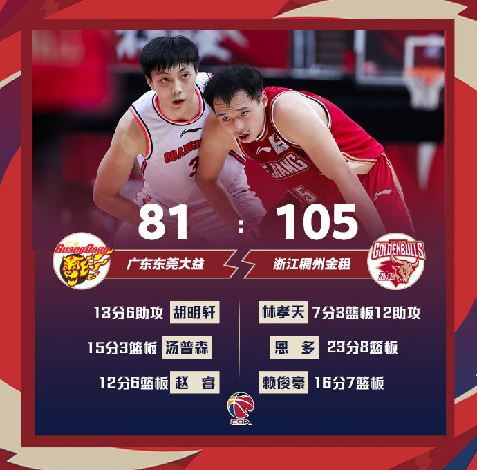 浙江(40-11):恩多23分8篮板4抢断3盖帽2助攻、赖俊豪16分7篮板、刘泽一15分6篮板、王奕博14分4抢断3助攻2篮板、时振恺14分3篮板2助攻、拉科塞维奇8分9篮板3盖帽、林孝天7分12助攻3篮板3抢断、王仔路6分4篮板4助攻、张洪硕2分。