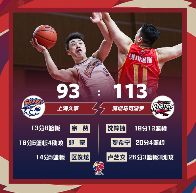 JRS直播网3月25日讯 今日CBA常规赛,上海迎战深圳。上海目前遭遇2连败,21胜24负排名积分榜第13位,深圳25胜20负排名积分榜第6。比赛开始,深圳里突外投取得12分领先,上海依靠内线优势逐渐缩小分差,首节战罢,深圳领先上海7分。次节上来,上海多次进攻不中,深圳一度将领先优势扩大至17分,随着区俊炫最后阶段连续得分,上半场结束,上海46-56落后深圳10分。易边再战,深圳继续压制上海,分差一度来到23分。末节上来,上海进攻回暖连续得分,深圳则里突外投稳住领先优势,比赛早早失去悬念。最终,深圳113-93大胜上海。