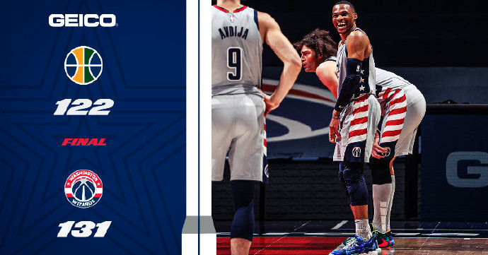 JRS直播网3月19日讯 NBA常规赛,奇才主场迎来爵士的挑战,奇才最近状态又有下滑,5连败后排在东部第13位;爵士的状态虽然也起伏不定,但战绩优势依然稳居西部首位,本场康利轮休。开局阶段奇才进入状态很快,威斯布鲁克带领打出9-0的小高潮拉开分差,爵士众将手感冰凉陷入得分荒,奇才领先11分进入次节。次节威斯布鲁克状态继续神勇,分差被越拉越大,米切尔最后时刻连续中远投帮助爵士苦苦追分,半场结束,奇才领先到18分。易边再战,爵士找回手感接连命中三分,米切尔也站出来连续突内线进一步缩小分差,比尔联手威斯布鲁克连续取分也能回应上,三节结束奇才依然领先18分。末节,爵士众将继续外线发炮维持着悬念,但威斯布鲁克和比尔总能回应上,奇才努力将分差保持在10分以上,最终奇才击退爵士,终止5连败。