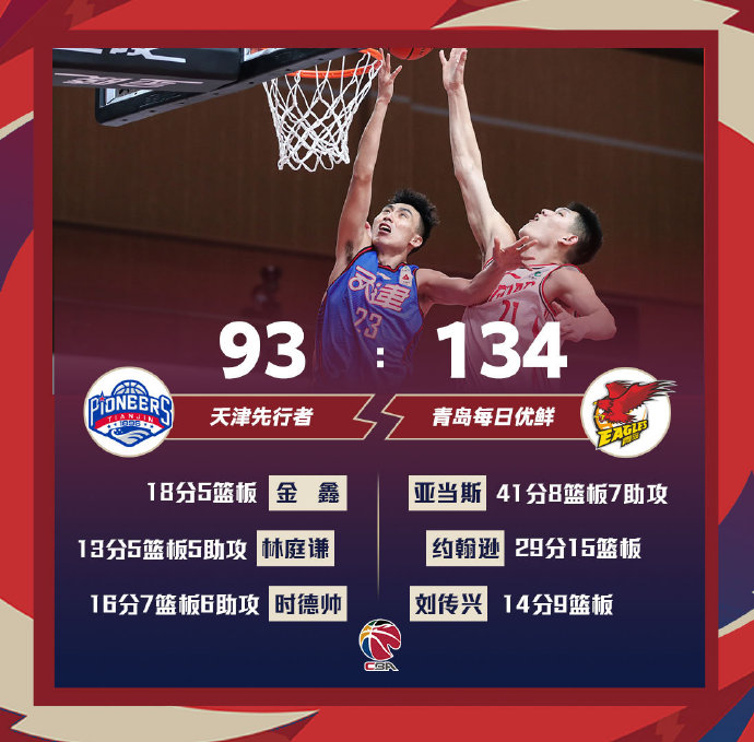青岛(23-21):亚当斯41分8篮板7助攻2抢断,约翰逊29分15篮板2助攻,刘传兴14分9篮板,王庆明8分5篮板,杨金蒙10分2篮板3抢断,张骋宇2分1助攻,许家晗2分4篮板1助攻,赵泰隆5分,赵大鹏6分1篮板2助攻2抢断