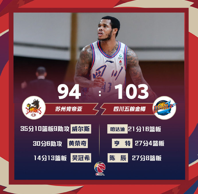 四川(21-17):陈辰27分8篮板、亨特27分4篮板4助攻2抢断、哈达迪21分16篮板7助攻1盖帽、景菡一5分3篮板2助攻、朱松玮5分10篮板2助攻2抢断、苏若禹4分5篮板、李原宇3分4篮板2抢断