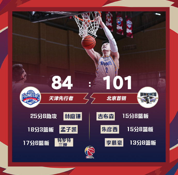 JRS直播网2月6日讯 CBA常规赛第39轮比赛继续进行,两连败的北京迎战六连败的天津,首节一上来朱彦西火力全开单节三分5中4,李慕豪和孟子凯先后内线取分,首节结束时北京领先6分,次节回来后北京不断拉开比分,林庭谦联手特罗特及时追分,半场战罢,北京继续领先8分。易边再战后北京内外结合再次拉开比分,双方分差一度接近20分,三节结束后北京已经领先19分,末节上来后天津一度迫近分差,但无奈此前分差过大,最终北京101-84力克对手。