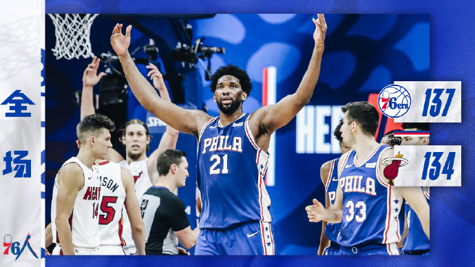 JRS直播网1月13日讯 76人今日坐镇主场迎战热火,76人遭遇新冠隔离问题导致人员不整,近期遭遇3连败让出了东部榜首位置,热火近期同样受新冠影响,上一场对阵凯尔特人凑不齐8人导致比赛延期。首节比赛76人依靠15-6的开局抢到领先,但后半节轮换热火回敬一波9-1的攻势迅速追上比分。次节热火外线突然爆发,这一节他们爆发命中8记三分轰下38分,半场结束时热火领先76人8分。第三节恩比德突然爆发, 他这一节4分钟里轰下18分,单节贡献20分3篮板3助攻带队实现反超,末节76人曾依靠开局格林的两记三分将优势拉大至两位数,但热火也有他们的英雄,希罗迎来爆发砍下12分,热火追平比分将悬念保留到最后。最后时刻对决热火依靠阿丘瓦连续得分反超比分,不过恩比德抗住压力命中投篮将比赛拖入加时。加时赛中恩比德状态火热包揽球队前9分,而马赛厄斯则在最后投进制胜三分。最终,76人加时惊险击败热火结束3连败。