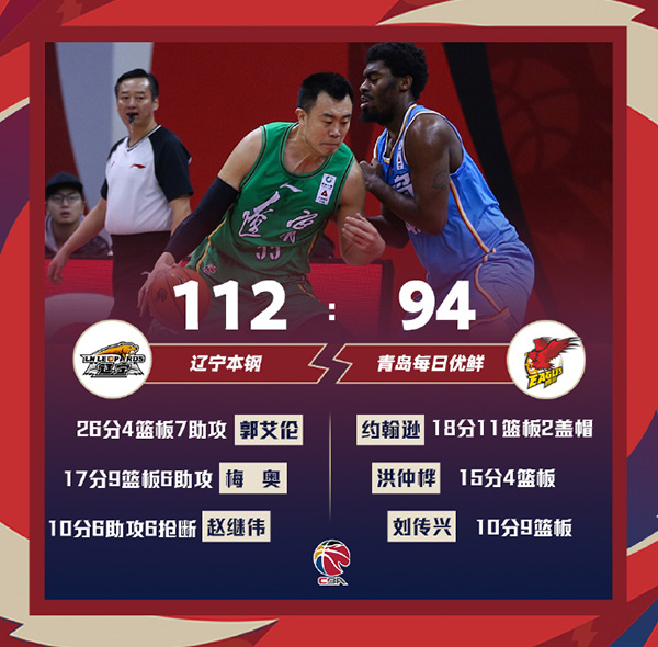 单节比分:25-31、21-37、20-26、28-18(青岛在前) 辽宁:郭艾伦26分4板7助、梅奥17分9板6助、赵继伟10分6助、韩德君6分、张镇麟9分、吴昌泽12分、丛明晨12分