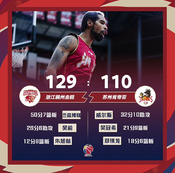 浙江(19-5):兰兹博格50分7篮板2助攻4抢断2封盖,吴前26分4篮板6助攻,程帅澎13分3篮板,朱旭航12分8篮板5抢断,张大宇7分8篮板,赖俊豪3分5篮板,王奕博9分2篮板2助攻5抢断,陆文博2分2抢断,拉科塞维奇7分3篮板。