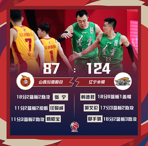 辽宁(23-3):韩德君18分9篮板、郭艾伦17分3篮板2助攻、鄢手骐16分3助攻2篮板2抢断、张镇麟15分、丛明晨14分3助攻、西蒙斯13分4篮板3助攻、梅奥12分4篮板4助攻、吴昌泽9分5篮板、朱荣振4分7篮板2助攻、刘雁宇4分3篮板、赵继伟2分12助攻3篮板2抢断。