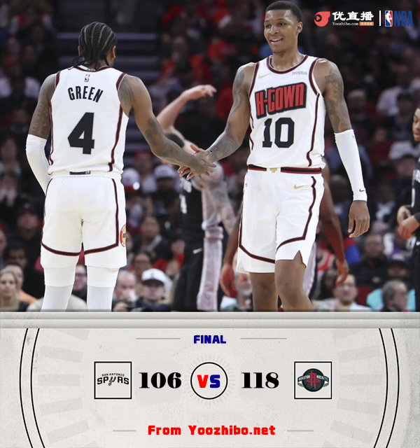 JRS直播网讯北京时间2月27日讯 NBA常规赛,火箭主场迎战马刺。火箭36胜22负排在西部第5,马刺24胜32负排在西部倒数第3。比赛开始,火箭率先发力,狄龙连中三分将分差拉开到两位数,马刺迟迟找不到感觉,火箭多点开花不断拉大分差,次节泰特三分一度帮助球队将优势扩大到20分,马刺连投带罚止住颓势,杰夫-格林连续拿分,半场战罢火箭64-46领先马刺。易边再战,火箭延续火力继续扩大优势,阿门连续补篮得手后三分也有,马刺连投带罚苦苦支撑,末节火箭稳扎稳打保持优势,马刺苦苦追赶无奈之前挖坑太大。最终,火箭118-106击败马刺,主场过关。
