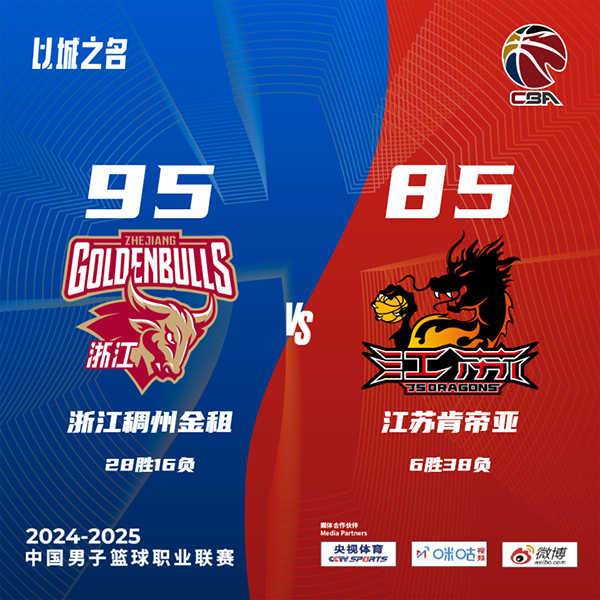 JRS直播网讯 北京时间3月24日讯 CBA常规赛继续开打,浙江和江苏迎来一场交手。江苏目前遭遇9连败且排在联盟倒数第一早早无缘季后赛,浙江目前取得2连胜还有机会冲一下更高的排名。首节之争浙江虽然一直占据上风但优势很小,最后3分钟里哑火仅得2分更是直接让出主动权,江苏在双外援古德温和汤普森的连续拿分中打出跨节16-5的攻势反超比分;不过江苏的进攻端没有其他人站出来,浙江则在熄火的被动中找回状态,后半段他们用一波19-6的攻势夺回5分优势。第三节开局浙江慢热再度丢了主动权,不过江苏刚刚取得领先就又一次哑火,浙江没有再浪费机会,他们随后轰出28-10的攻势直接拉开比分彻底接管比赛,末节浙江虽然哑火8分钟仅得8分,但江苏也完全无法起势导致分差一直再两位数。最终,浙江轻取江苏,并送江苏10连败。