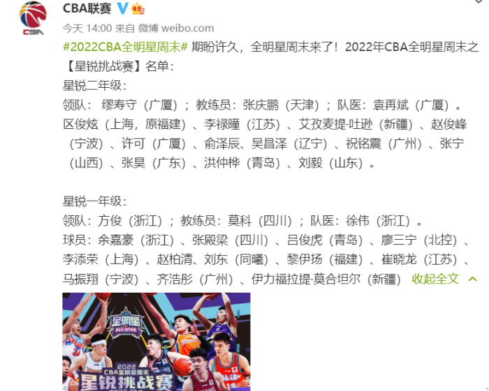 2022CBA全明星周末原本计划在佛山进行,后来改在青岛,又因为各种因素影响,最终改在了诸暨进行,比赛时间是12月1日到3日,也是在常规赛第二阶段开始前,各队都可以抵达诸暨,举办全明星赛更为方便。全明星赛的阵容早已确定,北区郭艾伦、赵继伟、韩德君、张镇麟和阿不都沙拉木领衔首发,南区易建联、周鹏、赵睿、胡明轩和胡金秋首发,这其中周鹏已经转会深圳,胡金秋有伤在身。山东男篮只有陶汉林进入北区替补阵容,他也是连续参加全明星的比赛。