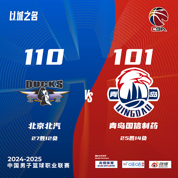 末节,曾凡博投中个人第二个三分球,纳托尔助攻周琦空接扣篮,北京队开局完成一波9-2的攻击波,将比分反超为84-81。暂停后,赵嘉义突破上篮,曾凡博急停中投得分。赵嘉义投中个人第四个三分球,但周琦的内线高度优势无人能挡,北京队领先4分。暂停后,威瑟斯庞三分命中,同时张才仁假摔领到技术犯规。周琦抢下进攻篮板后完成“双20+”数据,但威瑟斯庞和王睿泽连续投中3分。随着曾凡博在最后26秒送出致胜封盖,北京队最终以110-101惊险战胜青岛队,取得7连胜,而青岛队则是3连败。