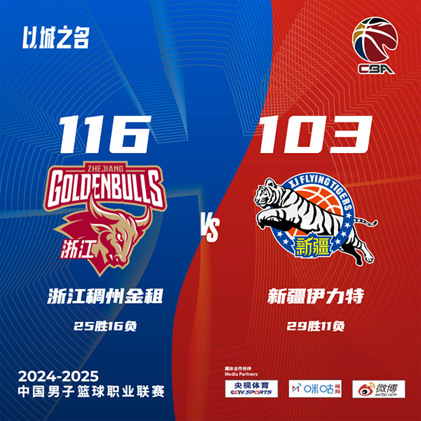 末节,程帅澎和琼斯连得5分打停新疆,赵睿和齐麟连续突破得手,吴前上篮完成“2+1”回应,齐麟三分得手后赵睿突破上篮,双方展开对攻。该节过半赵睿助攻劳森上篮将比分追到91-107,浙江请求暂停,此后两队否从内线寻找得分办法,李炎哲与余嘉豪相撞后受伤退场,劳森在该节还有两分钟时两罚全中将分差追到8分。关键时刻吴前两罚全中王奕博三分锁定胜局,浙江男篮主场116-103击败新疆男篮。