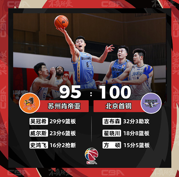 JRS直播网12月27日讯 CBA常规赛第23轮比赛继续进行,近期三连败的北京迎战四连败的江苏,首节一上来北京火力全开确立两位数领先,中段江苏不断追分但随后进攻再次停滞,首节结束时北京暂时领先8分,次节回来后两队外线火热对飚,半场战罢,北京继续领先8分。易边再战后北京开局再次打出10-0小高潮,随后吴冠希联手威尔斯不断追分,三节结束时北京依然领先8分,末节决战,江苏一度追至只差3分,但吉布森联手方硕稳住局势,江苏最后时刻追分未果,最终北京100-95力克江苏终结三连败。