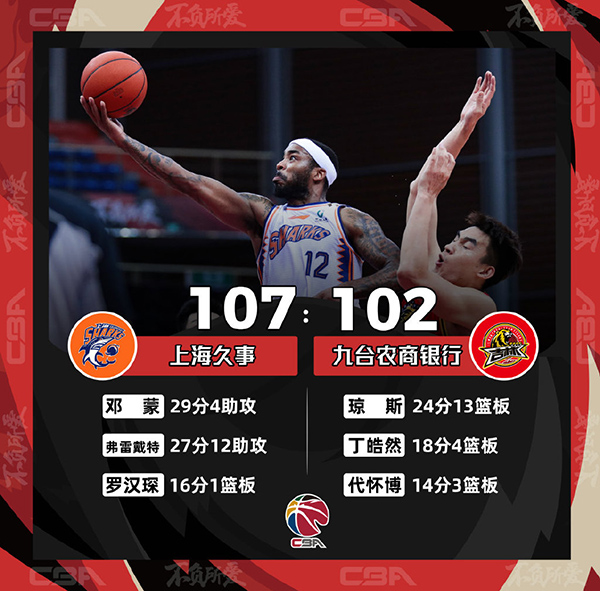 JRS直播网12月26日讯 CBA常规赛第23轮比赛继续进行,两连胜的上海迎战两连败的吉林,刘炜代替因病缺席的斯帕夏场边执教,姜宇星本场伤愈复出,首节一上来两队陷入僵持,中段吉林连中三分拉开比分,首节结束,吉林暂时领先8分,次节回来后上海双外援轮番冲击,率队连续打出得分高潮,半场战罢,上海反超对手2分。易边再战后双方进攻稍显停滞,上海末段找回状态,再次打出9-0小高潮拉开比分,三节结束,上海已经领先12分,末节上来后丁皓然单节飚中四记三分,关键时刻弗雷戴特连中三分,罗汉琛飚中关键三分,吉林最后阶段追分未果,最终上海107-102力克吉林迎来三连胜。