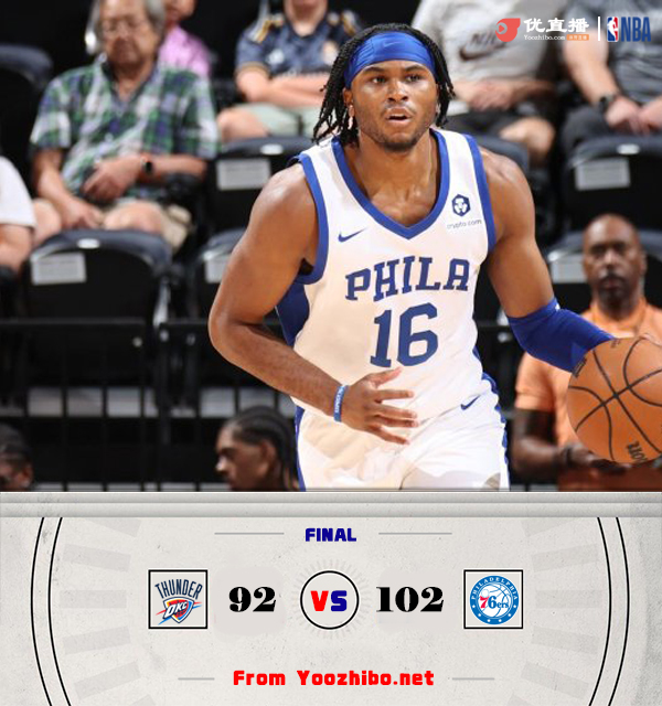 JRS直播网讯 7月9日 NBA盐湖城夏季联赛,雷霆今日对阵76人。比赛上来,雷霆就率先进入状态打出10-2的开局取得领先,不过及时调整的76人在首节后半段逐渐追了回来,首节双方战至26-26平,次节双方依旧是大打对攻战,但76人显然攻势更猛单节砍下32分,半场结束时雷霆落后7分;下半场回来,双方的命中率都出现下降,不过分差一直保持在十分左右,到了末节76人率先找回进攻感觉,他们没有给雷霆任何迫近比分的机会,最终76人轻取雷霆迎来开门红。
