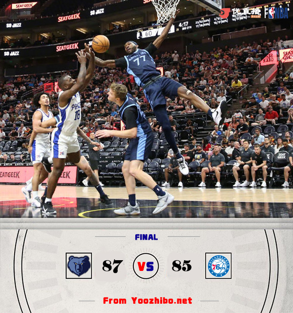 JRS直播网7月10日讯 NBA盐湖城夏季联赛,灰熊对阵76人。比赛开始,76人三分3连击很快取得两位数领先,灰熊不断冲击内线拿分追赶,76人持续发力一度将优势扩大到18分,斯潘塞连中三分止血,次节76人命中率骤降,灰熊大举反击,多点开花打出14-3的攻击波迅速迫近比分,76人迟迟找不到节奏,灰熊内外开花在半场结束时将比分扳成49平。易边再战,双方陷入缠斗,比分交替领先,末节灰熊率先发力打出7-0的攻击波,76人内外开花迅速回应,双方争夺陷入白热化,关键时刻威尔斯单打完成绝杀,灰熊87-85险胜过关。