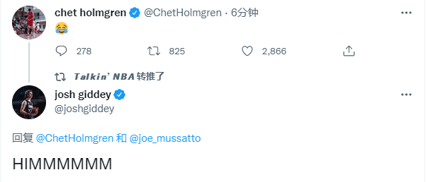 雷霆大胜赛后,霍姆格伦第一时间发推,配上一个笑哭的表情,算是对外界质疑声的强势回应;吉迪回复切特,写道:他他他。