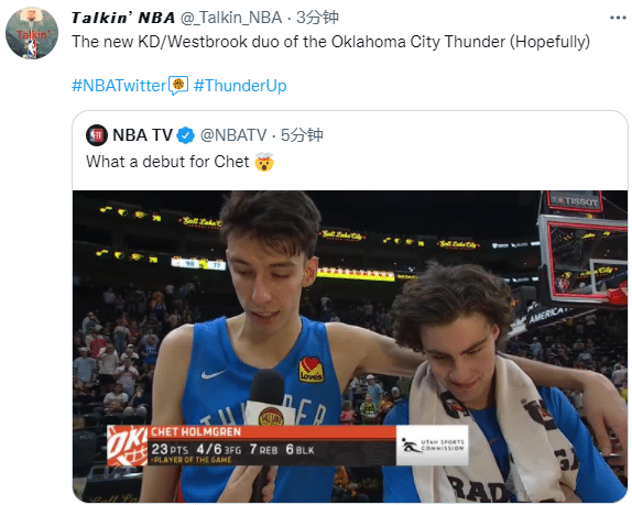 对于雷霆队的天赋,美媒发推直言:希望霍姆格伦和吉迪是雷霆新的杜兰特和威少;今日一战,吉迪全场14分11助攻5篮板2盖帽2抢断。