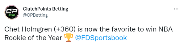 另外霍姆格伦新赛季最佳新秀的赔率飙升到+360,已经成为最佳新秀的大热门。