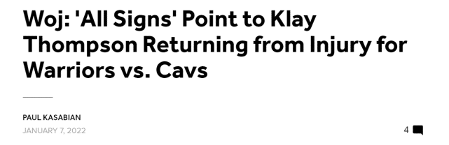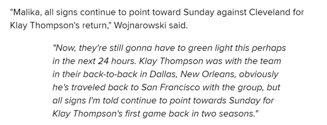 “他们(勇士)很可能在未来24小时为汤普森开绿灯。勇士在达拉斯和新奥尔良打背靠背时,汤普森是随队的状态,他也跟着球队回到旧金山了。我被告知,所有迹象表明汤普森将在周日(当地时间,北京时间周一)出战两年来的第一场比赛。”