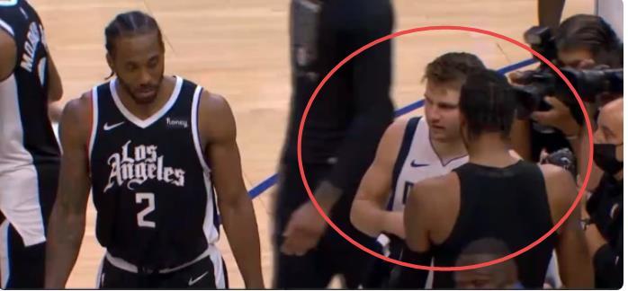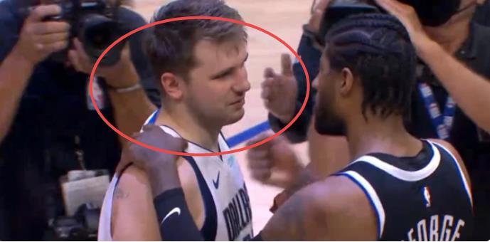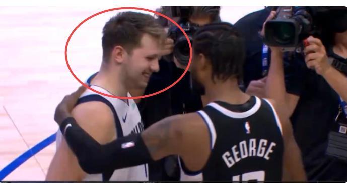 在表扬完东契奇后,乔治脱下了球衣,显然他想和东契奇交换球衣,按照常理,作为小字辈的东契奇是不会拒绝老大哥的要求,可是此时好玩的事情来了,东契奇竟然拒绝了乔治的要求,这也让脱下衣服的乔治显得有些尴尬,不过乔治的脸上也很快露出了笑容。