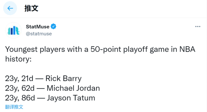 第三,塔图姆以23岁86天的年龄成为季后赛历史第三年轻50分先生,仅次于23岁21天的里克巴里以及23岁62天的篮球之神乔丹!