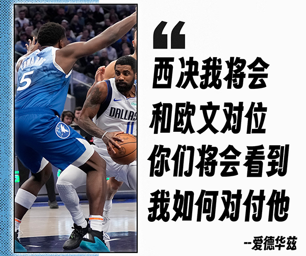 西部决赛开始前,爱德华兹放出豪言,会锁死独行侠的欧文,他表示:“我会对位欧文,这将会很有趣。你们将会看到我怎么对付他。”不过很显然,爱德华兹在西决G1防守欧文做得并不算好,甚至有点被打脸。