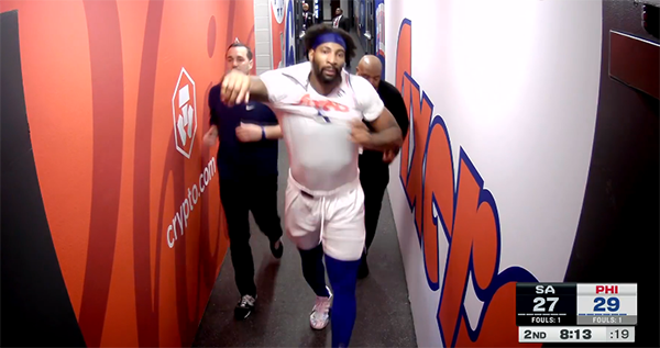 JRS直播网讯北京时间12月24日,NBA常规赛马刺客场大战76人,第二节场上出现争议判罚,庄神连吃两T被驱逐,纳斯怒喷裁判,之后裁判取消庄神的技犯,庄神又从更衣室中回到场上继续比赛;上半场最后阶段,恩比德怒喷裁判连吃两T被驱逐离场。