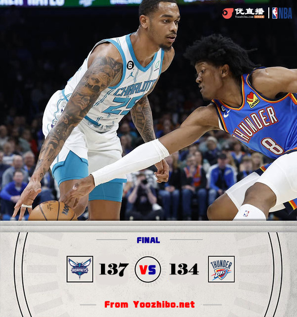 JRS直播网3月29日讯 NBA常规赛继续进行,雷霆坐镇主场迎战黄蜂,此前雷霆37胜38负位列西部第十,黄蜂则是25胜51负排名东部第十四。本场亚历山大缺阵。比赛开局,缺少主将的雷霆进攻效率不高,与黄蜂陷入拉锯战,两队交替领先。次节雷霆找到进攻状态,杰伦-威廉姆斯连续杀伤禁区,单节砍下17分,带领球队单节得到45分,一举领先到两位数,半场结束雷霆68-57领先。易边再战,黄蜂找到进攻状态,紧咬比分,分差在十分上下浮动,雷霆领先6分进入第四节。末节场上形势风云突变,华盛顿突然爆发,予取予求单节砍下22分,帮助黄蜂反超并一度领先到13分,但雷霆还是在终场前将比分追上,理查兹完成关键补扣,雷霆连续两罚一中错失扳平机会,最终黄蜂137-134逆转战胜雷霆,取得三连胜。