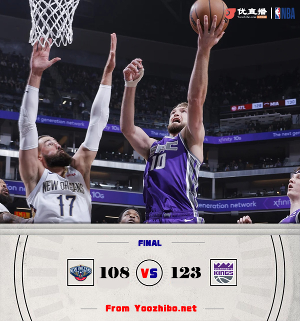 JRS直播网3月7日讯 NBA常规赛继续进行,国王主场迎战鹈鹕,国王目前37胜26负继续高居西部第3,而鹈鹕则是31胜33负排在西部第9位,福克斯因腿筋酸痛缺战本场比赛。双方上来就展开对攻战,英格拉姆状态不错,得分的同时还能串联起球队,两队命中率都很高,国王也是全民皆兵能咬住比分,随后许尔特找到手感接连外线发炮帮助国王一波8-0反超比分,但鹈鹕也依靠出色的三分手感再次追平比分。下半场,小萨博尼斯终于发力,进攻端得分助攻样样有,国王顺势领先到双位数,第三节末莱尔斯带领国王替补将分差继续拉大至18分,末节国王越打越好领先至20分以上,鹈鹕无力回天,最终国王123-108击退鹈鹕。