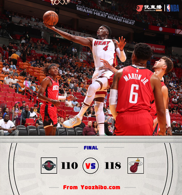 JRS直播网10月11日讯 火箭和热火今日迎来一场季前赛对决,火箭一众新人在季前赛表现相当不错且两战全胜,热火目前季前赛三战两胜。上半场的争夺双方效率奇高,首节火箭以格林砍下11分为首,加之火箭节中送出12-0的攻势一度拿到两位数领先;但热火在第二节轰出更加高效的进攻,他们这一节开局送出14-4迅速追上比分,单节狂轰38分的同时反超1分进入下半场。下半场的对决热火在拉锯战中笑到最后,尤其是第四节初一波12-3的进攻高潮直接将优势扩大至16分奠定胜局。最终,热火击败火箭迎来季前赛三连胜,而火箭则遭遇季前赛首败。
