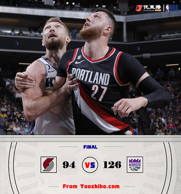 JRS直播网10月10日讯 NBA季前赛继续进行,开拓者客场挑战国王,比赛开始后两队早早进入状态,福克斯外线对飚西蒙斯,中段开拓者进攻断电,许尔特连中三分率队打出12-2攻击波,末段开拓者进攻再次停滞,萨博尼斯予取予求率队再次打出9-0小高潮,首节结束后国王确立12分优势,次节回来,开拓者找回进攻状态,两队你来我往火热对攻,努尔基奇联手西蒙斯不断追分,但国王多点开花总能及时回应,半场战罢,国王已经领先17分。易边再战后国王延续进攻火力,莱尔斯和蒙克轮番冲击,国王再度打出13-3攻击波,三节结束后国王将分差扩大到21分,末节上来,两队接连换上替补阵容,比赛提前失去悬念,最终国王126-94大胜开拓者。