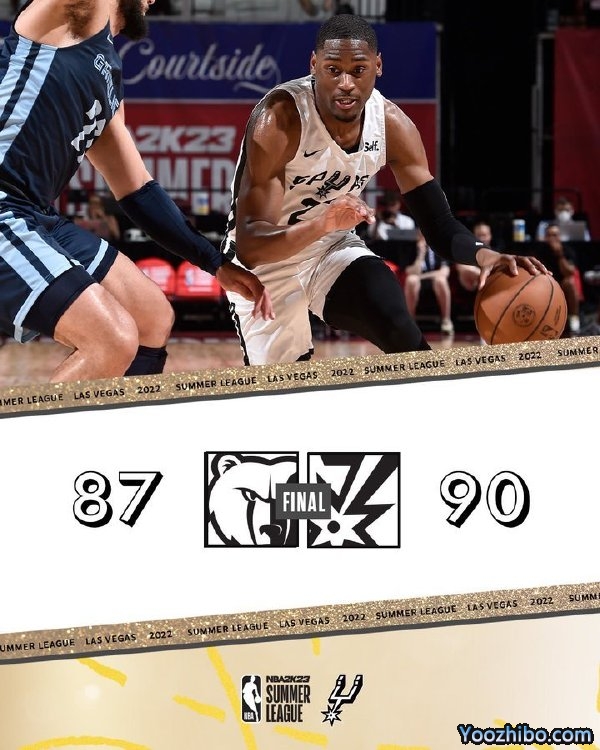 JRS直播网讯7月17日讯 拉斯维加斯夏季联赛今日继续开打,马刺和灰熊迎来一场交手。上半场争夺两支球队状态相当,虽然首节灰熊率先一波10-0的攻势发动进攻,但马刺很快做出回应迅速追赶上来,不过马刺虽然能咬住比分且多次追平比分,但始终无法反超导致局面稍显被动,最后时刻豪尔和韦斯利的三分进球帮助马刺抹平比分进入下半场。下半场马刺抢占先机在第三节取得久违的领先,而灰熊开局糟糕的表现也直接导致落后9分进入第四节;不过第四节的灰熊迅速组织反击,本场状态出色的“小胖”洛夫顿开场连拿9分,灰熊用一波14-2的进攻高潮一举夺回主动权,不过面对末节独砍15分险些带队翻盘的洛夫顿,马刺这边也有自己的超级英雄,布兰汉姆末段轰进4记三分砍下14分带队反超并守住胜利。最终,马刺惊险击败灰熊结束4连败并迎来夏季联赛首胜。