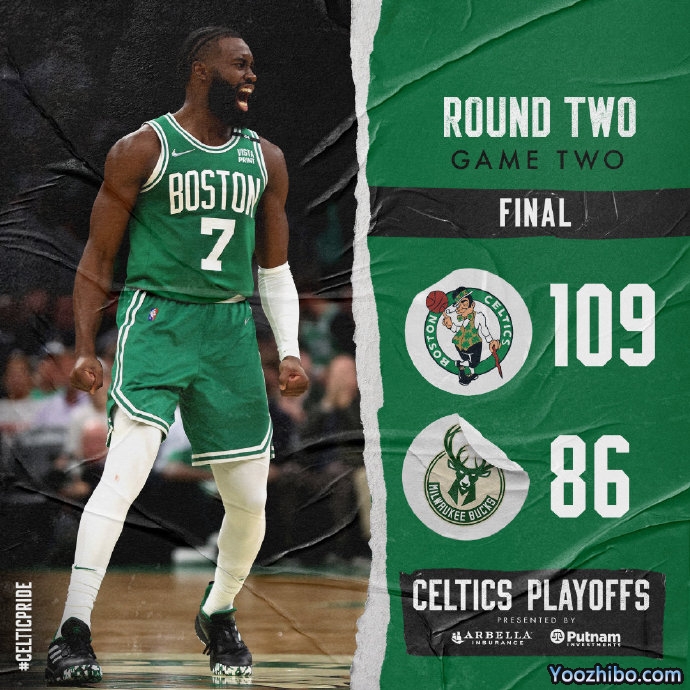 JRS直播网5月4日讯 NBA季后赛东部半决赛第二场,凯尔特人今日继续迎战雄鹿,两队首场比赛雄鹿轻松拿下胜利将主场优势夺回,本场斯玛特因伤缺战。比赛上来凯尔特人就一扫颓势7-0完美开局,分差也是逐渐拉开到了两位数,而雄鹿这边进攻状态一直低迷,前两节就砍下25分的布朗帮助凯尔特人在半场结束时领先25分。易边再战,字母哥终于进入状态单节拿到18分,不过由于此前分差过大,雄鹿始终没能将分差缩小回个位数,最终凯尔特人大胜雄鹿,将大比分追至1-1平。