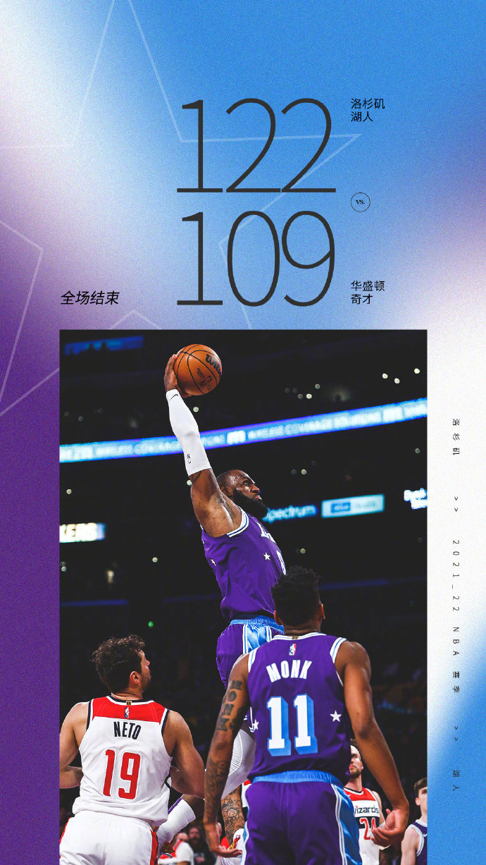 JRS直播网3月12日讯 NBA常规赛继续进行,湖人主场迎战奇才。湖人同奇才的这笔交易到目前来看是非常失败的, 球队遭遇2连败仅排在西部第九,奇才则是东部倒数第五,仍保留着冲进附加赛的机会。一开场,詹姆斯得分助攻一肩挑帮助湖人开局10-4领先,奇才多点开花回敬9-0的攻击波,首节双方战成26平。第二节,双方依旧势均力敌,比分始终紧咬,末段奇才凭借8-0的攻势在半场结束时以59-52领先7分。下半场,詹姆斯挺身而出,里突外投独得19分帮助球队逆转颓势,三节打完湖人反超7分。第四节,詹姆斯得分助攻一肩挑带队取得两位数领先,随后内外开花拿到个人本场第50分彻底杀死比赛。最终,湖人击退奇才,结束2连败。