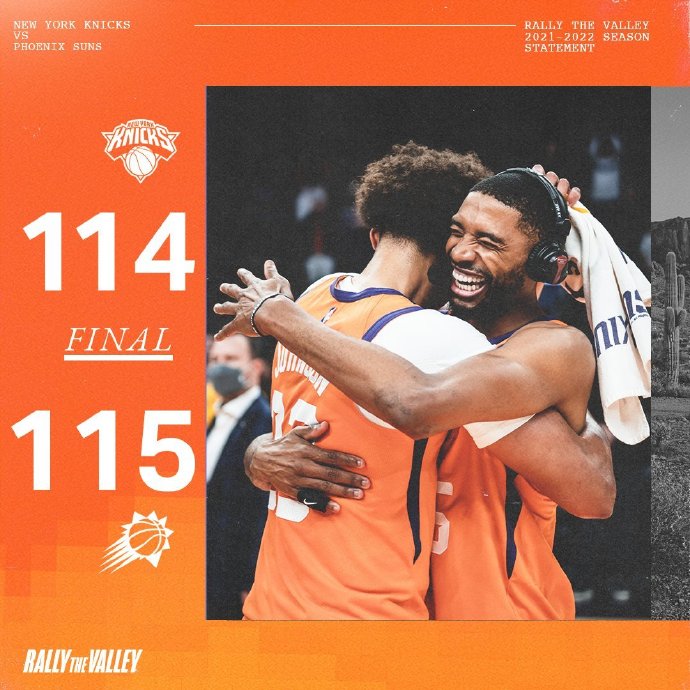 JRS直播网3月5日讯 NBA常规赛继续进行,高居联盟第一的太阳主场迎战尼克斯,缺少布克和保罗的太阳上场大胜开拓者终结连败,而尼克斯近来遭遇六连败位列东部倒数第四,此役一上来两队手感火热陷入僵持,兰德尔予取予求首节独得14分,布里奇斯连中三分率队逐渐占优,首节结束时太阳领先2分,次节回来,两队太阳延续外线火热手感,沙梅特和约翰逊连中三分,尼克斯多点开花继续紧咬比分,半场战罢,太阳继续领先3分。易边再战后富尼耶联手兰德尔打出7-0小高潮,尼克斯一举反超,随后双方你来我往继续僵持,兰德尔与约翰逊爆发冲突,前者累积两T被驱逐,但尼克斯多点开花扩大优势,三节结束后尼克斯反超12分,末节上来,约翰逊连进三分率队打出9-0小高潮缩小分差,约翰逊手感滚烫单节轰下21分,尼克斯内外结合总能及时回应,关键时刻克劳德飚中反超三分,罗宾逊补篮打进再度反超,约翰逊最后时刻上演压哨三分绝杀,最终太阳115-114险胜尼克斯。
