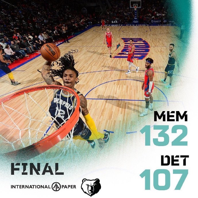 JRS直播网2月11日讯 NBA常规赛灰熊对阵活塞,灰熊近来状态不错取得3连胜,活塞5连败后继续东部垫底。开场后灰熊早早打出攻势取得领先,首节活塞进攻表现一般防守也比较差劲,灰熊单节便取得22分领先。第二节活塞不断冲击内线掀起反扑,不过灰熊外线手感稳定多次射中三分,上半场灰熊65-50领先。下半场回来两边大打对攻战,格兰特和迪亚洛两人轮番砍分,但灰熊在莫兰特带领下也是打得风生水起,第三节两队打成平手,最后一节灰熊仍旧占据场上主动,一直保持20分左右的优势,活塞无力缩小分差,最终灰熊132-107轻取活塞迎来4连胜。