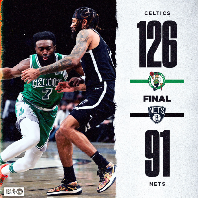 JRS直播网2月9日讯 篮网在结束5连客之后回到主场迎战凯尔特人,篮网近期状态全无遭遇8连败,在杜兰特和哈登因伤缺阵的情况下,欧文也无法出战主场比赛,因此篮网本场以全替补阵容出战。篮网的全替补阵容在开局完全找不到状态,开场8分钟里他们16投1中并出现5次失误仅得2分,绿军面对对手送上的如此大礼自然是不会放过,他们在布朗独砍12分的带领下轰出28-2的进攻高潮早早拉开比分,篮网在这之后才找到进攻感觉尝试追分,次节初他们用一波9-2的开局曾将分差追至12分,但这之后的绿军再度接管比赛,斯玛特站出来连拿8分带队再掀进攻高潮,绿军很快拉开比分并带着26分的优势进入下半场。第三节绿军依旧占据上风半节时间再送16-7的攻势,分差直接拉大至30分以上也让比赛早早失去悬念。篮网随后只能为缩小分差挽回颜面而战,不过早早撤下主力的绿军也没有给对手任何机会。最终,绿军客场大胜篮网,并送篮网9连败。
