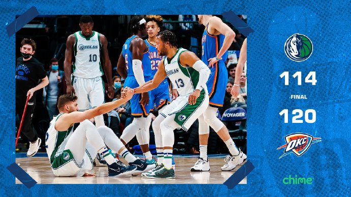 JRS直播网2月3日讯 NBA常规赛,独行侠主场迎战雷霆,此役雷霆核心亚历山大和独行侠大将波尔津吉斯均作壁上观。首节东契奇手感火热,一人里突外投无所不能,然而雷霆却靠着基迪、多特和维金斯的三分雨取得领先,次节雷霆替补进攻哑火,独行侠趁机打出一波7-0反超比分,好在基迪、多特等主力回归后雷霆重回正轨,半场结束前顽强的将比分追平。第三节两队展开三分对飚大战,独行侠这边虽然火力不弱,奈何对面三分超神,曼恩、多特等人单节飚中七记三分为球队取得了9分的优势,末节布伦森及时挺身而出,他以一己之力带队打出11-1的反击缩小比分,怎料之后他们却陷入4分多钟的得分荒错失追分良机,好在东契奇之后大发神威带队反超比分,雷霆则靠着威廉姆斯的空接将比赛拖入加时。加时赛多特一人连得14分打了对手一个措手不及,东契奇则未能延续末节的手感,只能眼睁睁看着分差被拉开,最终雷霆120-114击败独行侠。