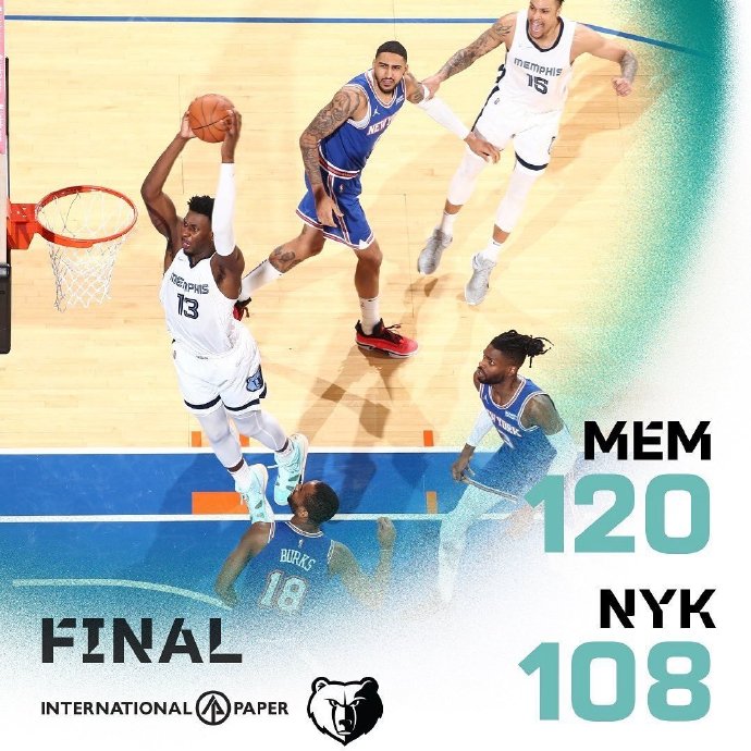 JRS直播网2月3日讯 NBA常规赛,尼克斯今日迎战灰熊,前者上场比赛大胜国王排名东部第十一位,后者则是惜败76人暂列西部第三位。比赛上来灰熊就率先进入状态取得领先,虽然尼克斯及时调整将比分追至11-11平,但在首节末段灰熊还是将分差拉开到了两位数,之后的比赛尼克斯一直处于落后,半场结束时灰熊领先12分。易边再战,尼克斯虽然多次发起反扑,分差也是回到个位数,但始终没能获得反超的机会,兰德尔更是在最后时刻吃到个人第二次技犯被驱逐,最终灰熊轻取尼克斯避免连败。