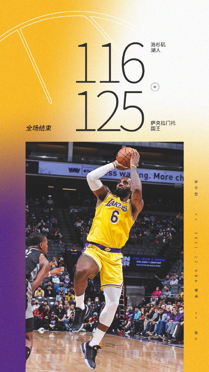 JRS直播网1月13日讯 NBA常规赛继续进行,国王主场迎战湖人,国王此前状态不是很好,一波5连败已经掉落至西部第12位,而湖人4连胜后惨败于灰熊目前也掉落至西部第7位,本场安东尼因腰部紧张缺阵。开局湖人外线手感不错,但国王也是连续冲击内线给出回应,双方打得非常胶着,湖人依靠自身的经验优势,在詹姆斯的带领下占据5分领先,次节国王上来外线手感不错将比分追平,但詹姆斯又站出来里突外投帮助湖人打出超级进攻波一举建立双位数领先,节末国王也回应8-0小高潮将分差又追至6分。第三节风云突变,虽然湖人外线三分还能帮助止血,但国王通过连续冲击湖人孱弱内线,配合着外线巴恩斯的三分,国王打出超级进攻波并单节轰下40分一举建立双位数的领先,末节湖人依靠外线三分紧急追分,但国王也都能给出回应,双方外线对飚,但国王始终保持领先,虽然最后时刻詹姆斯一度帮助湖人追到差2分,但梅图三分一击毙命,最终国王击退湖人,终止自己的5连败。