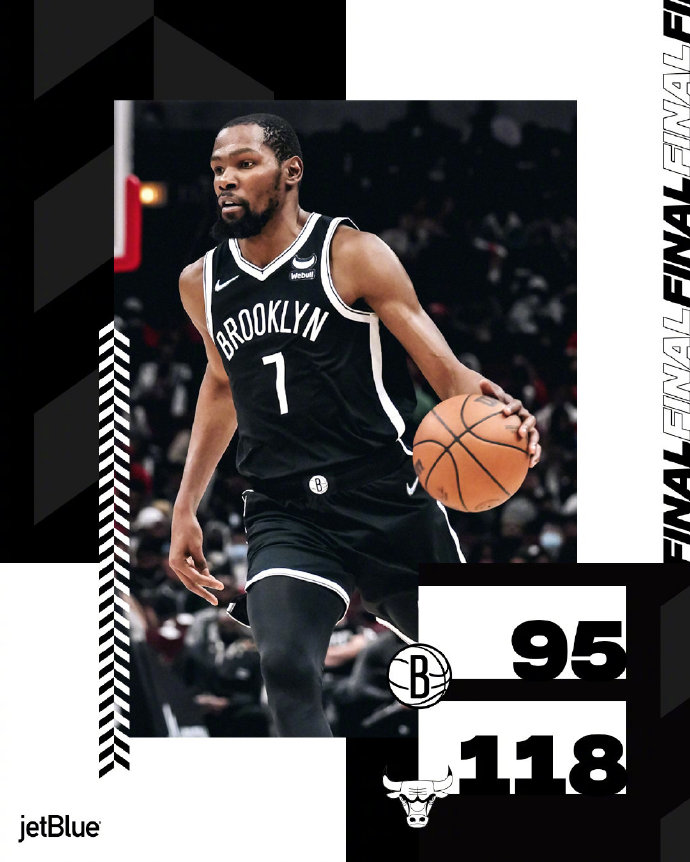 篮网(7-4):杜兰特38分10篮板4助攻,哈登14分8篮板5助攻,哈里斯9分5篮板2助攻,阿尔德里奇19分7篮板2封盖,米尔斯5分2助攻,本布里4分2抢断。