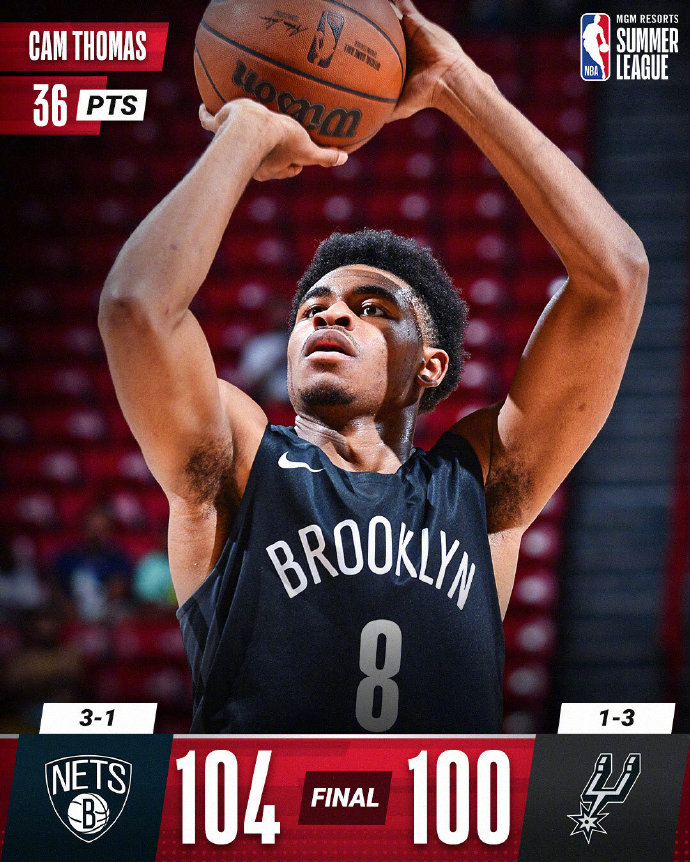 JRS直播网8月16日讯 NBA夏季联赛,篮网今日对阵马刺,前者已经取得两连胜,而后者在上场比赛才险胜黄蜂取得首胜。比赛上来马刺就展示了火热的外线手感,连续命中多记远投,而篮网的进攻效率则是极低,场上分差迅速就达到了两位数,次节篮网虽然多次发起追分,但半场结束时仍落后5分。易边再战篮网继续反扑,在第三节末段他们打出一波10-2的攻势终于实现反超,末节两队开始陷入拉锯,比赛悬念一直保持到了最后,关键时刻托马斯连续得分帮助篮网带走胜利,最终篮网险胜马刺,获得三连胜。