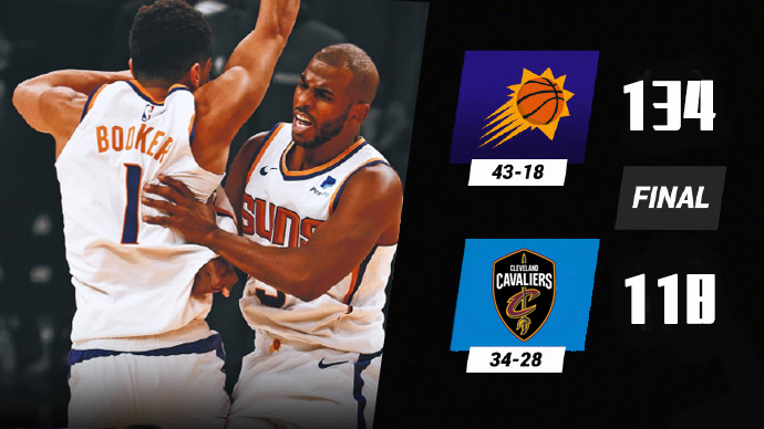JRS直播网5月5日讯 NBA常规赛太阳对阵骑士,近来太阳取得4连胜仍旧紧追爵士排在西部第二,骑士则是遭遇6连败。开场后布克就展现出火热手感,他一人独得11分,但骑士多点开花反而取得领先,不过佩恩和萨里奇替补登场后发挥出色帮助太阳反超比分。第二节回来骑士首先外线开张,保罗逐渐找到状态,他除了自己砍分还不停为队友送出助攻,上半场太阳59-53领先骑士。下半场回来骑士仍旧率先外线发力,不过在艾顿的发挥下太阳一度领先到两位数,但多特森和塞克斯顿两人联手掀起反扑帮助骑士追平比分。第四节场上局面仍旧胶着,保罗带领太阳始终保持略微优势。最后阶段奥科罗连续强硬突破帮助骑士将比赛拖入加时。加时赛中骑士突然断电,太阳一波15-0的攻势直接拉开比分锁定胜局,最终太阳加时134-118拿下骑士取得5连胜,骑士遭遇7连败。