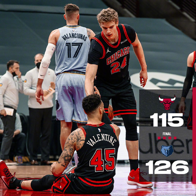 JRS直播网4月17日讯 NBA常规赛灰熊对阵公牛,刚开场两队就连续在外线对飚三分,虽然灰熊一度取得领先,但公牛马上追上比分。第二节轮到公牛率先发力掀起攻势,灰熊进攻内线再度追平比分,场上局势仍旧胶着,上半场结束时两队打成57平。下半场回来虽然公牛进攻仍旧表现不错,武切维奇频频砍分,但他们防守不佳被灰熊打出高潮拉开比分,第四节灰熊将领先优势稳定在两位数,公牛无力回天,最终灰熊126-115送给公牛5连败。