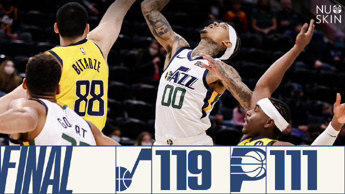 爵士:博格达诺维奇24分3篮板,米切尔22分4篮板,克拉克森18分5篮板,戈贝尔13分23篮板4封盖,英格尔斯11分6篮板3助攻,康利10分10助攻。